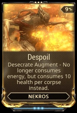 ファーミングのもう 1 つの優れたオプションは、Nekros とその Desecrate 能力です。倒した敵からボーナス アイテムを受け取ることができます。ただし、このスキルは大量のエネルギーを消費するため、Despoil mod の助けを借りて、この問題に対処することができます。 Desecrate はエネルギーの代わりにあなたのヘルスを奪います。