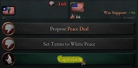 Victoria 3 では、ある地域で軍を徴兵すると、戦争が終わるまで動員解除できなくなります .戦争には費用がかかり、軍隊に十分な賃金がないと思うので、画面上の戦争シンボルの「降伏」ボタンをクリックして戦争を終わらせることもできます。また、戦争を終わらせるために相手国と和平協定を結ぼうとすることもできます。