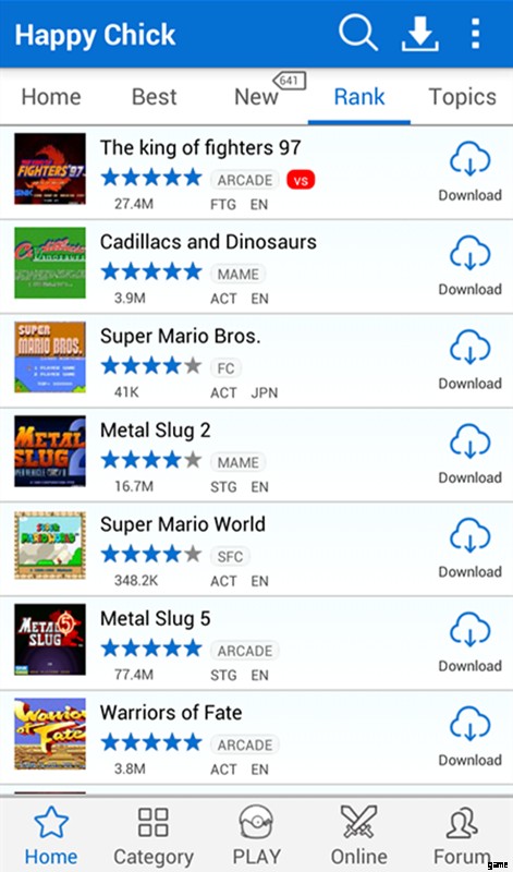 しかし幸いなことに、Xiaoji Studio この問題に対処することにしました。彼らは Happy Chick というユニバーサル エミュレータを作成しました .このアプリは、Android デバイスを Gameboy、PSP、Nintendo DS、Nintendo 64、PlayStation 1、2、および 3 などのレトロなコンソールに変えることができます。 、その他多数。