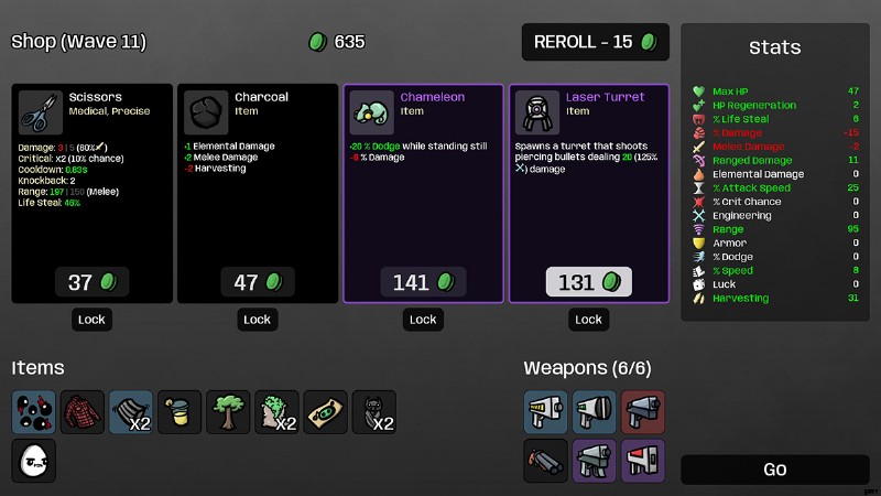 タレットの使用に飛び込む前に、実際にタレットを取得する方法を見てみましょう。タレットは Brotato の強力な武器であり、ゲームを開始したばかりのときは簡単に手に入れることはできません。しばらくゲームをプレイし、敵の波の後にアイテムショップからタレットを購入するのに十分なお金を稼いでいる必要があります.