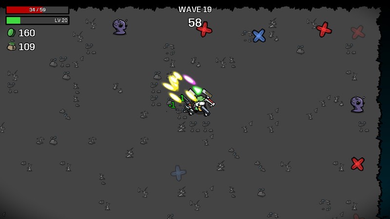 Brotato のすべてのウェーブが開始する前に、敵のスポーン ポイントを示す典型的な赤い X に気付くでしょう。タレットが優先され、敵よりも先にスポーンし、マップ上に青い X として表示されます。タレットはランダムなので、出現する場所に影響を与えることはできず、出現後にタレットの位置を変更することもできません。