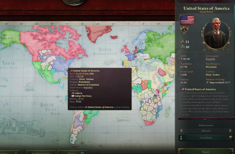ヴィクトリア 3 は、ヴィクトリア女王の治世中から第二次世界大戦が始まる頃までを舞台としています。最適な開始国を選択するというこの最初の決定は重要です。この間に存在する国は、プレイヤーが選択できます。