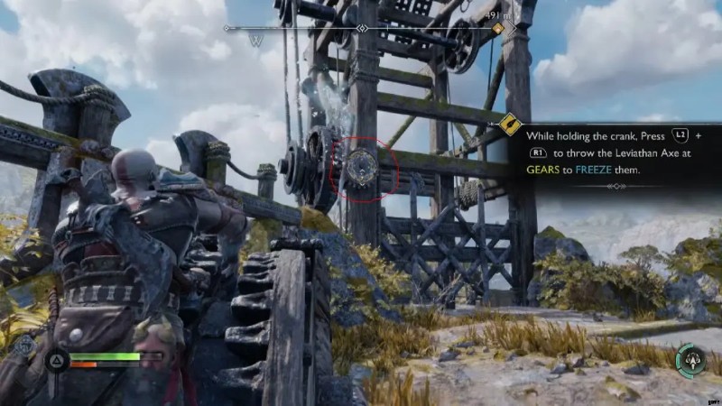 - 山に登り、ギアを使ってプラットフォームを上げます。 その後、斧を投げて建造物を凍らせます。