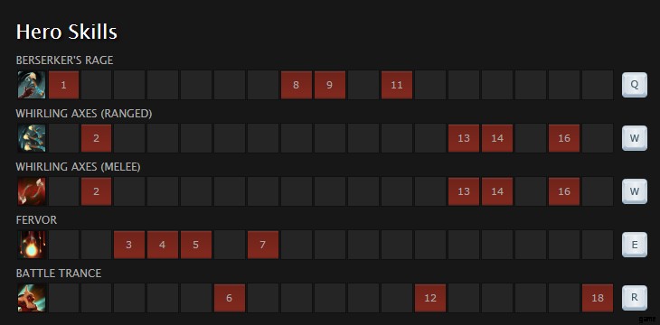 一般的に、状況に応じて行動する必要があります。最初のレベルでは、必ず最初のスキル (Berserkers Rage) を取得してください。後で2番目のスキルのレベルを上げますが、1番目と3番目のスキルが優先されます.また、アルティメット (バトル トランス) が利用可能になったらアップグレードしてください。 .