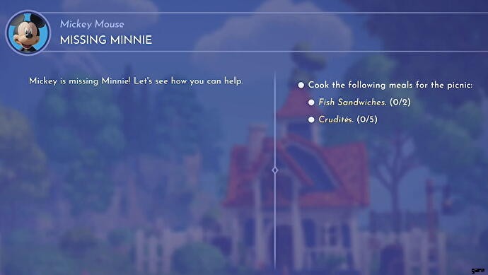 たとえば、ミッキー マウスと話した後 、行方不明のミニーを開始できます クエスト。名前が示すように、ミニーの検索に役立ちます。 .このクエストでは、Crudites を調理するよう求められます。 フィッシュ サンドイッチ .
