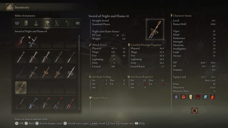 ソード オブ ナイト アンド フレイムは、エルデン リングのレジェンダリー ストレート ソードの 1 つで、24 の信仰と知性が必要であり、強さ、器用さ、知性、信仰の統計でスケーリングします。武器には 2 つのスタンスがあります。ナイト スタンスでは光の魔法を放つことができ、フレイム スタンスでは火炎ダメージを与えることができます。