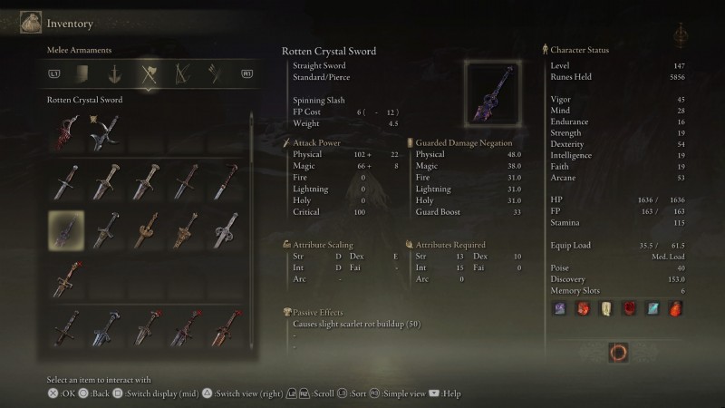 Rotten Crystal Sword は Elden Ring の Straight Sword で、Strength と Intelligence の統計値に比例し、Dexterity に多少比例します。この剣が優れた武器である理由は、緋色の腐敗の蓄積です。 Rotten Crystal Swordをデュアル装備すると、すぐにステータス効果を適用できます.