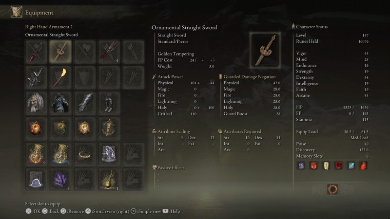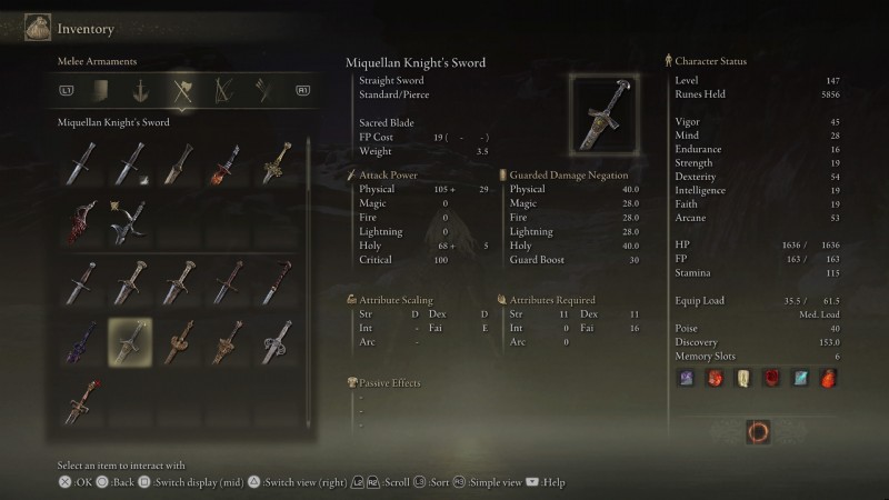 ミケランの騎士の剣は、武器スキルであるスケアード ブレードがホーリー ダメージを与えるホーリー マジックのスラッシュを投げるので、近距離および中距離からダメージを与えるのに最適です。この武器は、Strength、Faith、Dexterity のステータスに応じて変化し、優れた物理ダメージ ディーラーです。