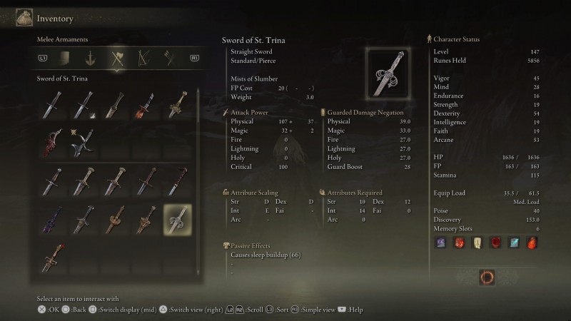 ソード オブ セント トリーナは、エルデン リングで唯一のスリープ ステータス付与武器であり、敵をスリープ状態にし、刺し傷をつきやすくします。