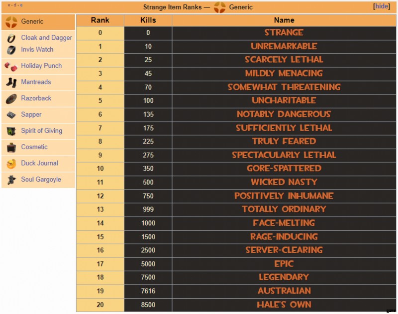 ストレンジ クオリティは、Mann Co のロックを解除することで得られる武器アイテムのクオリティです . 供給 .奇妙なランクの武器は、すべてのキルを追跡し、アイテム属性として記録します。記録された数が増えると、武器にランクが与えられ、アイテムの名前の先頭に表示されます。