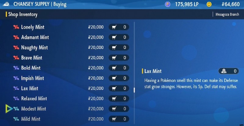 メサゴザに着いたら、中央広場を通り抜け、一番右のお店と交流。 それぞれ 20,000 ポケドルでさまざまなネイチャー ミントを販売している Chansey Supply Mesagoza 支店です .
