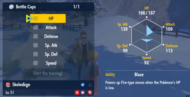 貴重なボトルキャップを手に入れた後 、モンテネベラに向かうべきです .あそこ、アボマスノウからそう遠くない 、NPC が見つかります ボトル キャップにサービスを提供する準備ができている人 . ハイパートレインができる あなたの ポケモン レベル 50 を超えると、6 つの ステータス のうちの 1 つが増加します .したがって、ポケモンのステータスをできるだけアップグレードしたい場合は、ボトル キャップが 6 個必要になります。 .そして、これらのボトル キャップ以来 育てるのが難しいので、賢く使う必要があります。