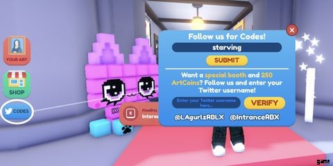 Roblox でコードを利用するには のスタービング アーティスト 、プレイヤーは Roblox でゲームを起動する必要があります 次に、画面の左側にある Twitter アイコンを選択します。このボタンをクリックすると、ユーザーがコードを入力して Art Coins の無料パックを請求できるテキスト ボックスのあるウィンドウが開きます。