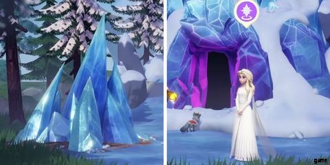 友情クエスト「歌う氷」中 " in ディズニー ドリームライト バレー 、雪の女王エルサは、氷の洞窟に大きな氷塊が出現する問題についてドリーマーに助けを求めます。氷河の洞窟を探索しているときに、彼女はアンナの彫像に触れ、洞窟の極寒の床から氷のようなスパイクを発生させました.これらの巨大なつららを取り除くために、エルザはディズニー ドリームライト バレーでツルハシ ツールをアップグレードすることをプレイヤーに勧めています。 Cold of Winter Potion と呼ばれる、呪文を注入した特別な調合を使用します。
