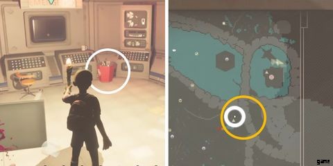 - 中央チャンバーの左側を見て、Grounded の実験室の場所にある赤いゴミ箱を見つけます。 .