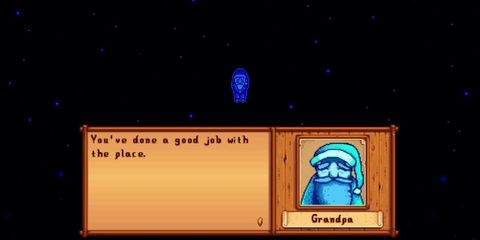 Players can complete many milestones just by playing through Stardew Valley's story, mining, and farming, and organic gaming should lead the player to at least 12 of the required points. When players feel they have all the required achievements and points, remember to bring a Diamond for the Shrine. Placing the diamond will summon Grandpa's ghost, and he will tell players their progress. This can be done at any time after the first evaluation, as there is no time limit to lighting all four candles after the third year.