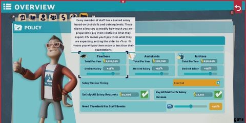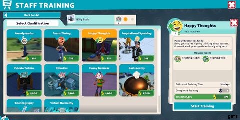 Players can boost the morale of their staff by offering training services, providing higher wages, giving exhausted staffers breaks from work, allowing for extra time in staff rooms, etc. Another helpful way to increase staff happiness is to use the Visualization feature that physically shows a player through color coordination which areas of the campus (including staffers) need to be improved and upgraded. Green denotes health, gray signifies aesthetic ugliness, and red equals hazard.