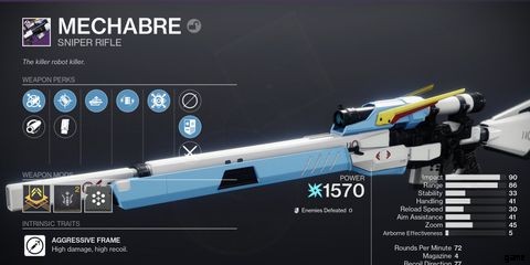 このスナイパーライフルには攻撃的なフレームが付属しており、高い反動と引き換えに高いダメージを出力します。幸いなことに、この欠点は適切なバレルを選択することで軽減できます。ガーディアンは精度とエイム ダウン サイト (ADS) の速度を向上させる Perk を優先するため、これは PvP ではあまり重要ではありません。 PvE では、プレイヤーは Mechabre を使用してクリアまたはボス ダメージを追加できます。