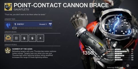 ポイントコンタクトキャノンブレースは、タイタンクラス専用のエキゾチックです。このアーマー ピースはサブクラスに関係なく着用できますが、ガーディアンはアークに同調する必要があります。これは、Hammer of the Gods と呼ばれる Gauntlets のユニークな Exotic Perk によるものです。ゲーム内の説明によると、Thunderclap Melee でターゲットを倒すと Melee Energy が回復します。さらに、サンダークラップを使用しているガーディアンの近くにいるターゲットは落雷を受けます。増幅されると、これらの落雷の範囲が広がります。 Amplified は、Destiny 2 の Arc 3.0 サブクラス バフです。 これにより、プレイヤーのスプリントが速くなり、ガンプレイにボーナスが付与されます。タイタンは、アーク武器で素早く倒すことでこの効果を得ることができます。また、ノックアウト アーク アスペクトを装備し、近接攻撃で敵を倒すことで増幅することもできます。