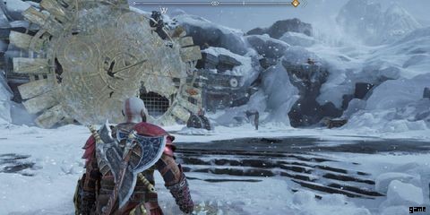 巨大な盾が左端の位置に保たれている場合、最後の松明は可動柱の先にあるため、もう少し工夫が必要です。がれきを粉砕すると、門を塞いでいる巨大な車輪が現れます。これは、シジルの矢と常に満足のいくリヴァイアサンの斧を使用してロックを解除できます。プレイヤーは、場所に入る前に、斧を使用して限られた時間両方を凍結する前に、シジルアローでホイールの両側にある 2 つのギアをターゲットにする必要があります。このエリア内の財務省の銀の封印を破壊すると、ホイールの動きが無効になり、プレイヤーは現在表示されている 3 番目のトーチへの道を形成し、ノルニル チェストのロックを解除できます。