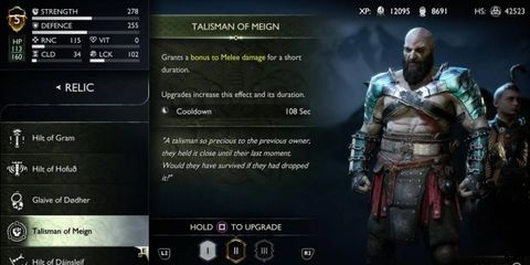 メインのテイルズマン 物語の「Quest for Tyr」の章、メインストーリーの2番目の全体的なセクションで、「The Path」とも呼ばれます。最初のエレベーターがレベルに入った後、壁の体がこのアイテムを保持し、前の所有者がレリックに対して持っていた愛を嘆く説明が書かれています.装備すると、プレイヤーは近接ベースのダメージにボーナスを与えるレリック アタックを短時間使用して、Kratos のすべての近距離攻撃を増幅することができます。