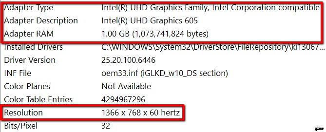 - アダプター に関する詳細情報が表示されます と解決 .以下では、このコンピューターの唯一のグラフィックス カードが、CPU に組み込まれている Intel UHD グラフィックスであることがわかります。どんな種類のゲームでも、明らかに専用の GPU が必要です。