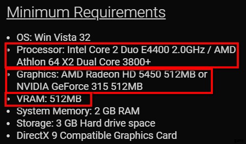- そこには、ゲームの最小システム要件と同様の情報が記載されていますが、それよりもわずかに高くなっています。また、最小要件の情報と同様に、CPU、RAM、およびグラフィックスに注目する必要があります。