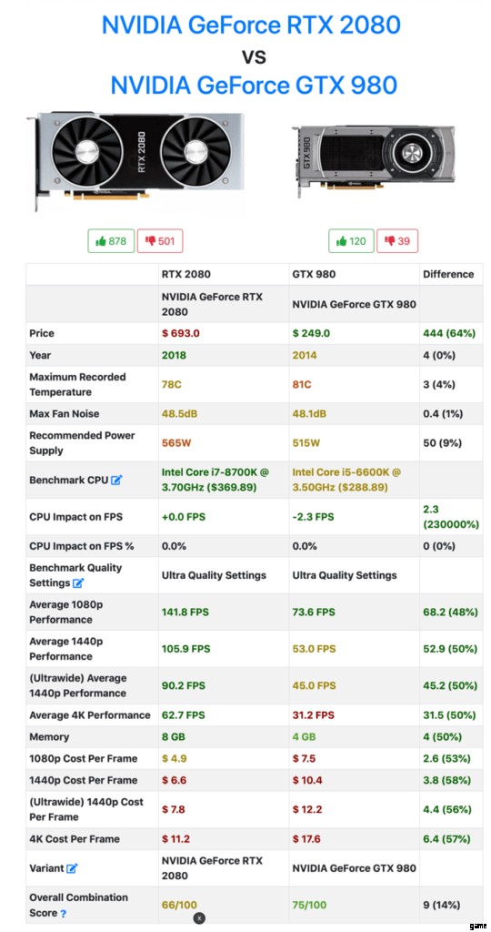 その決定を支援するために、GPUCheck などの GPU 比較 Web サイトをチェックすることをお勧めします。ここでは、現在の GPU を選択し、アップグレードとして購入する可能性のある別の GPU を選択できます。