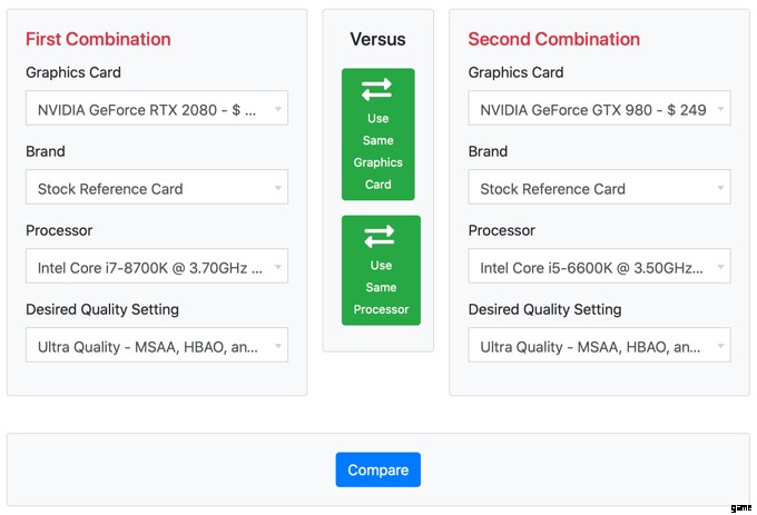 また、現在のプロセッサを選択して、アップグレードされたプロセッサを選択するか、[同じプロセッサを使用] をクリックしてください。 ボタンをクリックして、GPU だけをアップグレードするとパフォーマンスがどのように向上するかを確認してください。 [比較] をクリックします。 ボタンをクリックして比較を表示します。