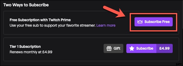 - This will bring up various subscription options. To use your free Twitch Prime channel subscription, press the Subscribe Free ボタン。