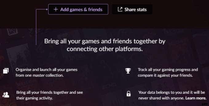 このボタンをクリックすると、ユーザーは他のプラットフォームを GOG に接続するか、ゲームを手動で追加できます。 Steam などの他のプラットフォームでアカウントを持っているユーザーには、安全、高速、無料の GOG に接続することを強くお勧めします。