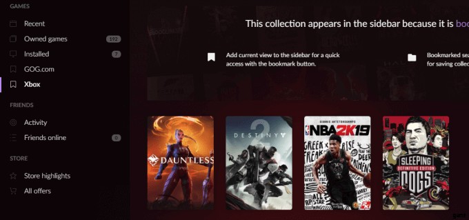 完了すると、接続されたプラットフォームがクライアントの左端のメニューの [ゲーム] の下に表示されます ユーザーがリンクしたプラットフォーム (この例では Xbox) としてラベル付けされています。