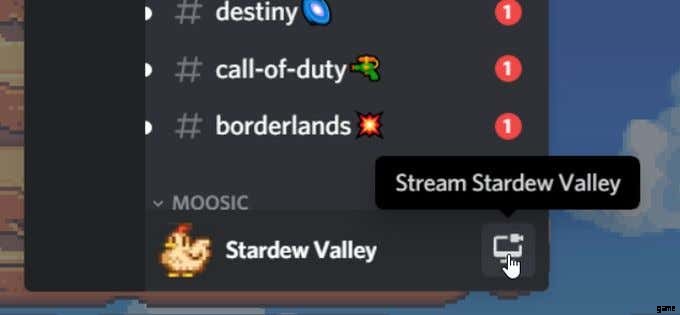 もう 1 つのオプションは、Discord でゲームプレイをストリーミングすることです。サーバー チャネルを使用している場合は、ゲームのタイトルの横の下隅にあるコンピューター アイコンをクリックできます。これにより、サーバーを介して、視聴することを選択した人にゲームのストリーミングが開始されます.