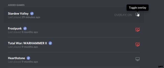 ゲームの横に、コンピューターのアイコンが表示されます。特定のゲームごとにオーバーレイのオンとオフを切り替えることができます。プレイしたいゲームのオーバーレイがオンになっていることを確認してください。