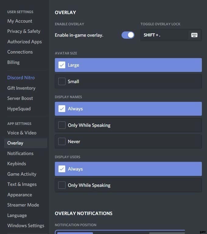 Discordを使用すると、この機能を非常に簡単に使用でき、好みに合わせてカスタマイズできます。選択したゲームだけで Discord オーバーレイを使用できます。オーバーレイをゲームの上に表示したり、自分で開かない限り完全に非表示に設定したりできます。