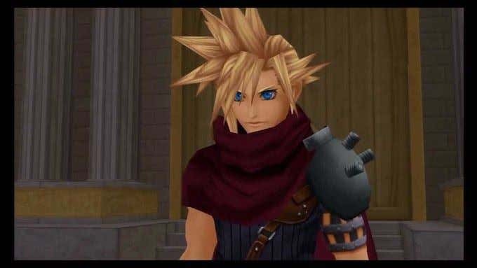 オプションのキャラクターとして、クラウド・ストライフには主要なストーリーの瞬間はありませんでした.彼のアートワークは、ファイナル ファンタジー VII とは少し異なりますが、細かいところだけです。たとえば、彼は標準の SOLDIER ユニフォームではなく、黒いタートルネックを着ています.