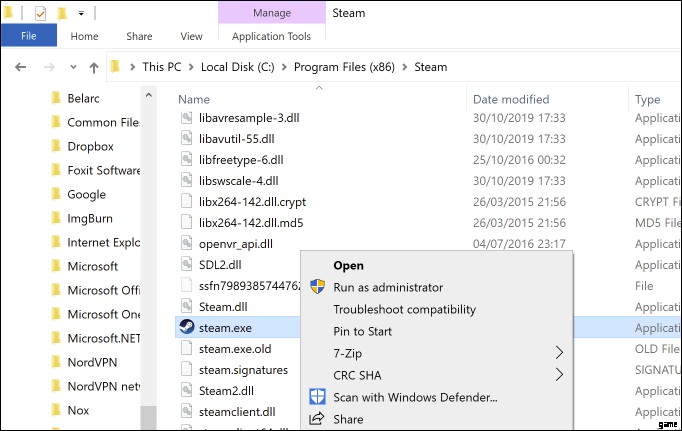 - これを行うには、Windows ファイル エクスプローラーで Steam のインストール ディレクトリを開きます (デフォルトでは、C:/Program Files (x86)/Steam)。 )。 steam.exe を右クリックします。 実行可能ファイルを開き、[管理者として実行] をクリックします。 管理者権限で実行します。
