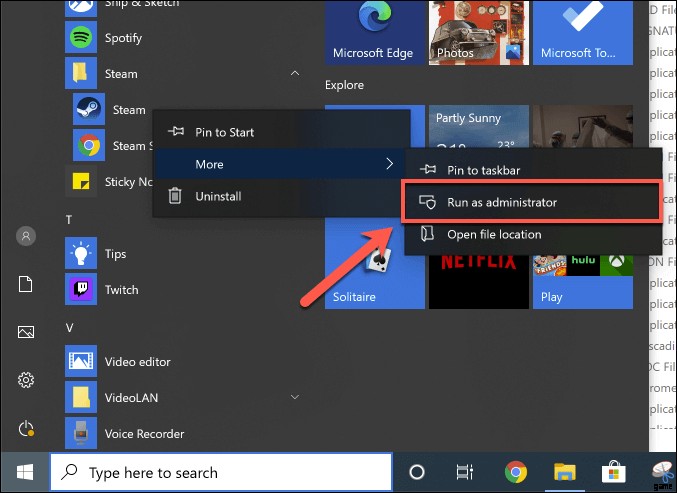 - これを行うには、[スタート] メニューに入り、アプリのリストで [Steam] を見つけて、エントリを右クリックします。 その他の下 サブメニューで、[管理者として実行] をクリックします。 オプション