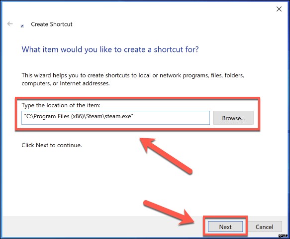 - ショートカットの作成 ウィンドウで、[参照] をクリックします steam.exe を見つける Steam クライアント用の実行可能ファイル。デフォルトでは、これは通常 C:/Program Files (x86)/Steam にインストールされます ディレクトリ。選択したら、[次へ] をクリックします .