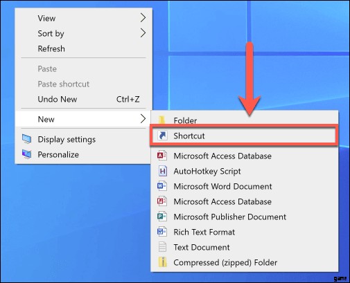 - これを行うには、Windows ファイル エクスプローラーまたはデスクトップで右クリックします。表示されるメニューで、[新規]> [ショートカット] を押します .
