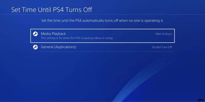 PS4 が自動的にシャットダウンするまでのアイドル時間は、1、2、3、4、または 5 時間から選択できます。 20 分後にシャットダウンすることもできます または単に オフにしないでください 一般 (アプリケーション) 用 オプション。