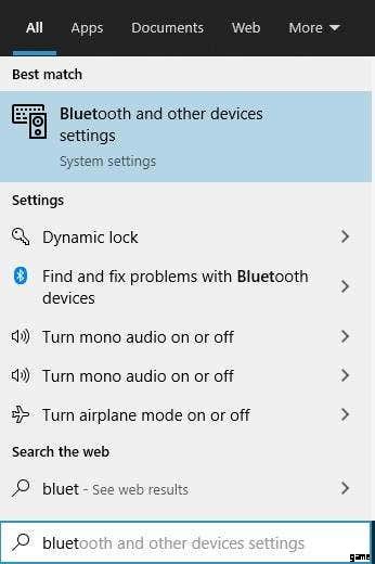 次に、[スタート] メニューを開き、Bluetooth を検索します をクリックし、[Bluetooth とその他のデバイスの設定] をクリックします。 .