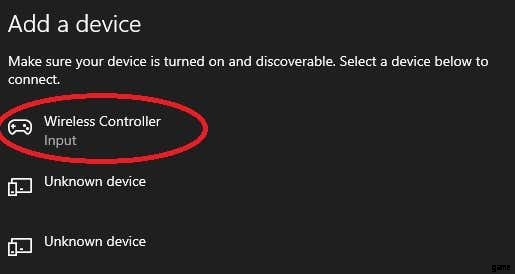 利用可能なデバイスのリストが表示されます。 PS4 コントローラーが ワイヤレス コントローラー として表示されるはずです .