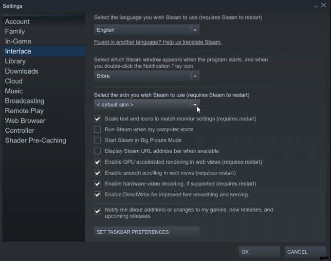 - Steam を開いて Steam に移動します> 設定 >インターフェース .
