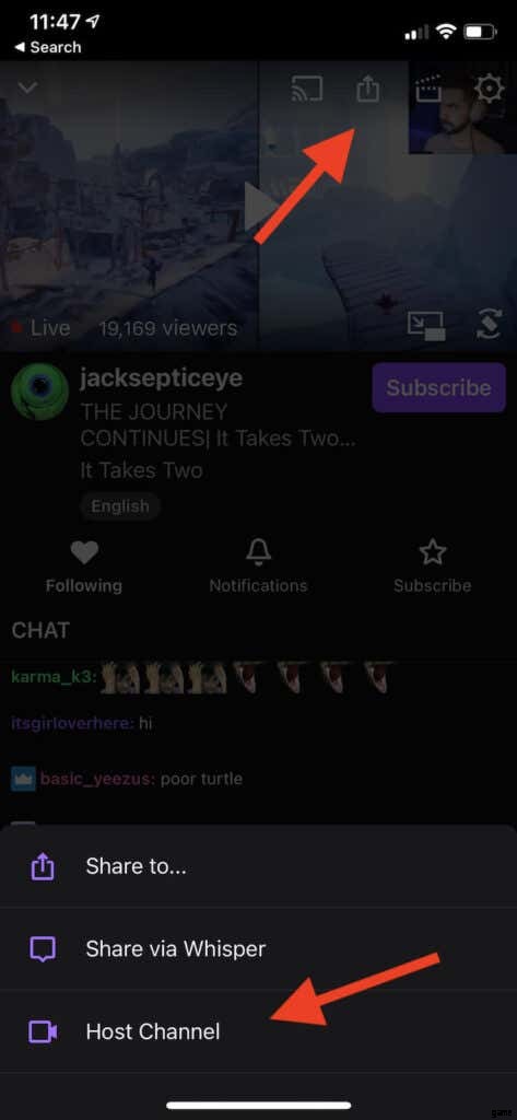 3 つのオプションが表示されます。 [ホスト チャンネル] をタップします 自分のチャンネルでストリーマーのホスティングを開始します。ホスティングを停止するには、[共有] をタップします ボタンをもう一度クリックして、[チャンネルのホストを解除] をタップします。