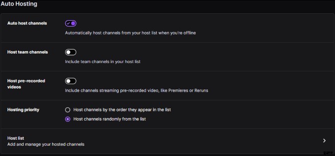 このガイドのこれまでのホスティング機能では、ホスティングの手動側と、Twitch でホスティングを開始するために必要なキーボード コマンドについて説明しました。ただし、Twitch では、オンラインでないときに事前承認済みのチャンネル リストを自動的にホストできます。
