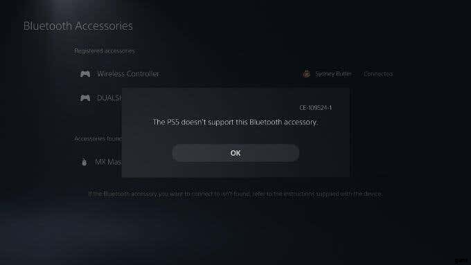 残念ながら、Bluetooth 経由でテストしたマウスでは、PS5 でこのメッセージが表示されました。
