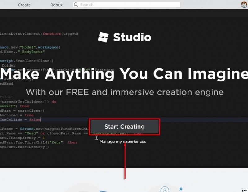 - [Studio をダウンロード] を選択します Roblox ゲーム作成ソフトウェアを取得します。