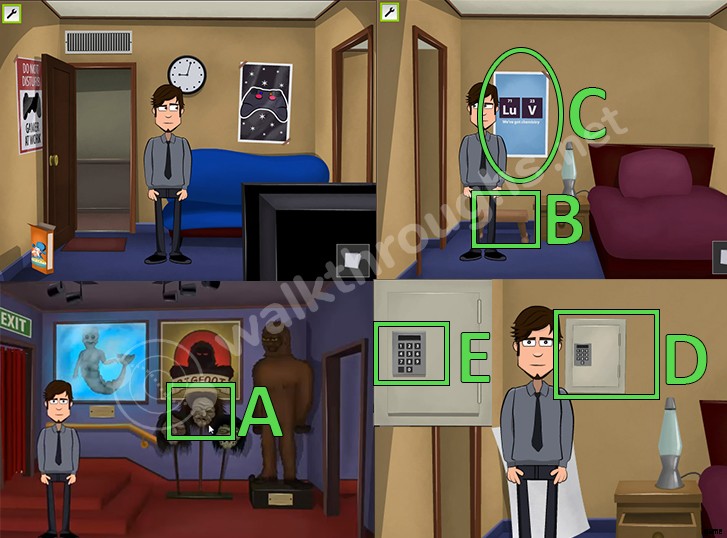 - 金庫をクリックします コードを入力します。コードはメモにあります ミュージアム オブ オディティーズから入手しました。 (D, E)