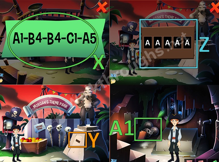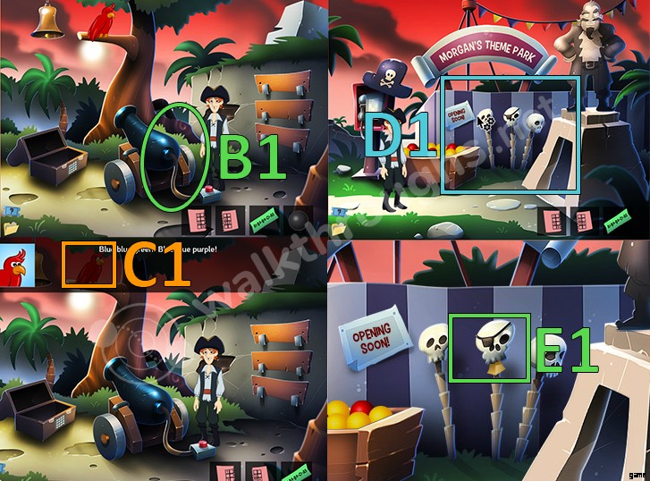 - なんてオウム スケルトンの頭についても言及していました モーガンのテーマパークで。 左の骸骨は青 、真ん中は緑 左は紫です。 オウムのヒントを使おう 次のステージに行くために。 (D1)